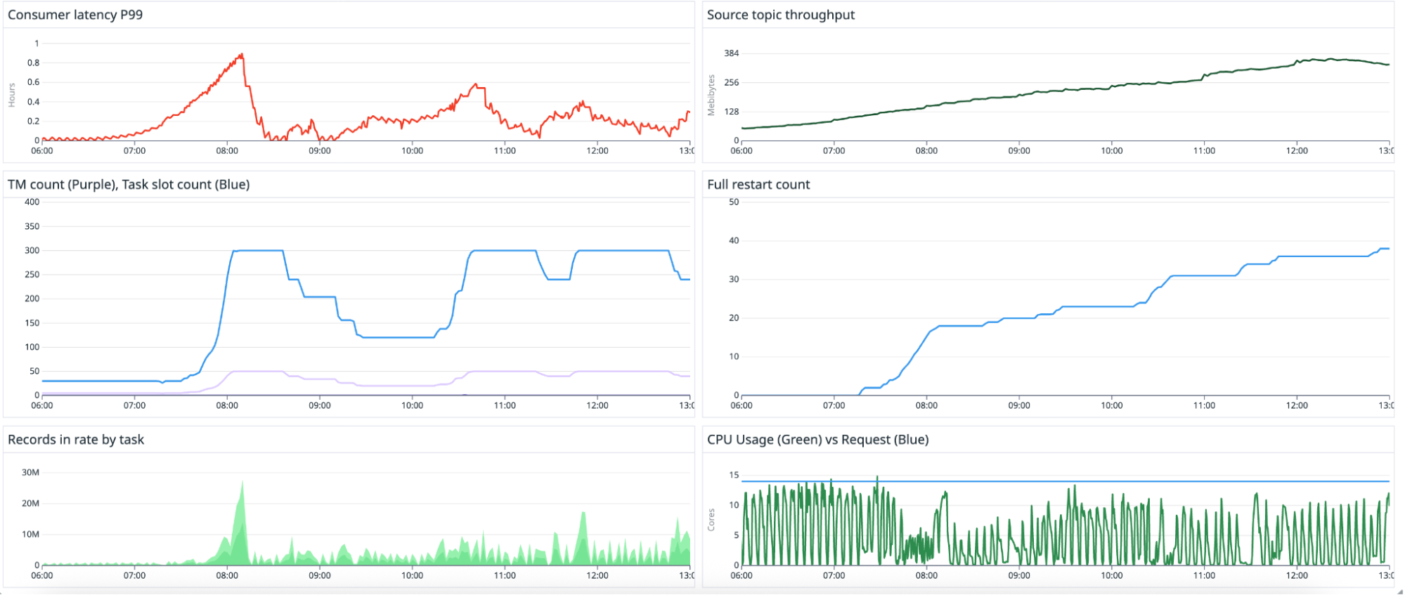 • 07:30: As the P99 consumer latency remains high, reactive scaling continues to scale out incrementally. The records in rate by task rises rapidly as the pipeline reprocesses data from the checkpoint. During this period, the pipeline repeatedly restarts CPU usage drops significantly, and P99 consumer latency spikes to nearly one hour. This marks the onset of a spiral failure.