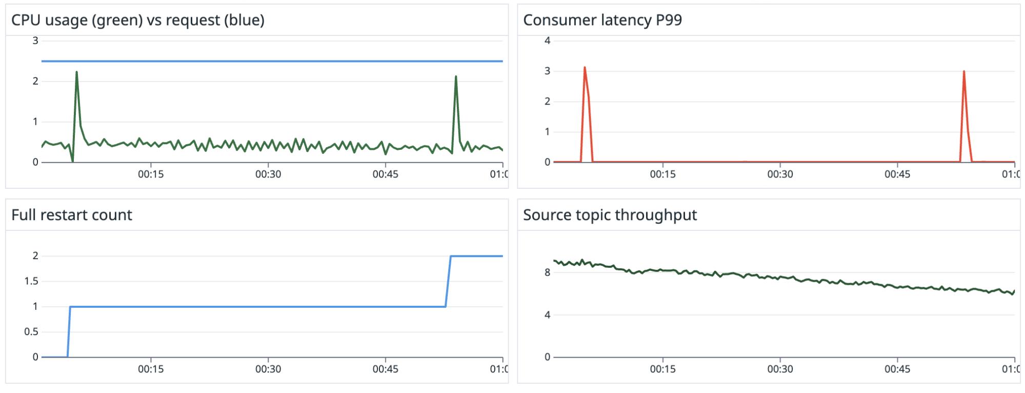 When autoscaling a Flink pipeline, the job restarts from the last checkpoint. This triggers an immediate spike in load, as the pipeline must reprocess records from the period between the last checkpoint and job restart, along with any new records that were backlogged at the source during the downtime. As a result, CPU usage and P99 consumer latency typically spikes after scaling events, for example, at 00:05 and 00:55, as shown in Figure 1. These spikes occur even though there is no change in source topic throughput. In this case, CPU usage surges from 0.5 cores to near provision limit of 2.5 cores, while consumer latency temporarily spiked from sub-second levels to as high as three minutes.