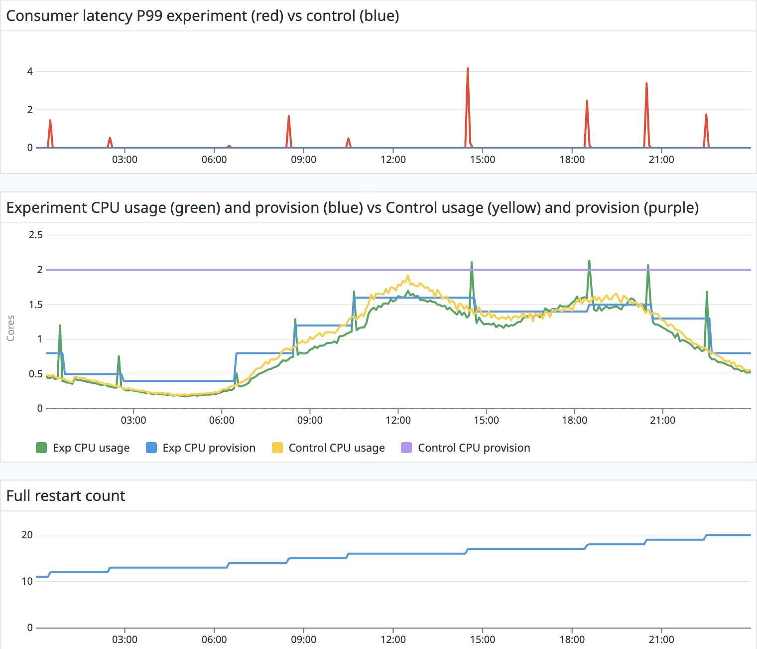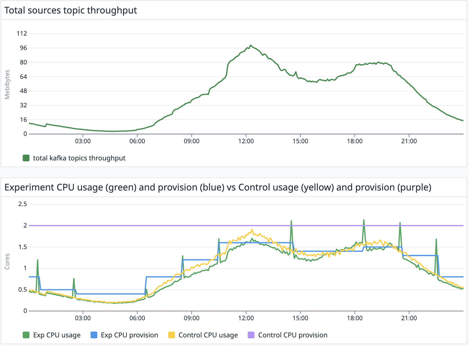 We set up an experimental pipeline with configurations identical to the production pipeline (the control). Both applications sourced data from the same Kafka topics but sank data to alternative topics to maintain isolation. The Predictive Resource Advisor was enabled on the experimental pipeline, while the control pipeline operated with fixed CPU provisioning.