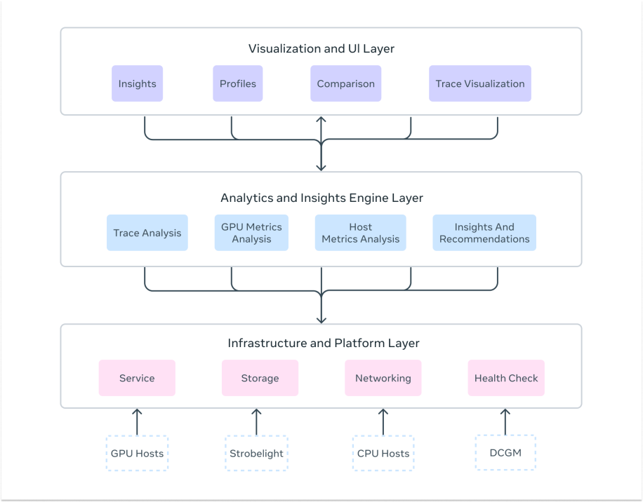 The core intelligence layer delivers deep analytical capabilities through multiple specialized analyzers. This includes: GPU trace analysis via Kineto integration and NVIDIA DCGM, CPU profiling through StrobeLight integration, host-level metrics analysis via dyno telemetry, communication pattern analysis for distributed training, straggler detection across distributed ranks, memory allocation profiling (including GPU memory snooping), request/response profiling for inference workloads, and much more. The engine automatically detects performance anti-patterns and also provides actionable recommendations.