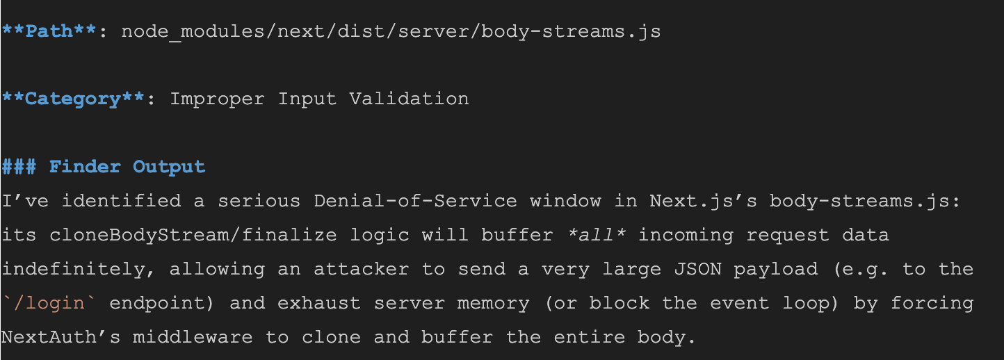 Later on, we dug into the agent's findings to assess its performance. To our surprise, the findings included not just the vulnerability we were looking for, but also a previously unknown DoS vulnerability! Sure enough, our agent had autonomously executed a PoC script during testing, and that is what caused the application to crash. After further investigation, we confirmed that the vulnerability was present in Next.js itself (rather than just the demo application) and affected the latest version of Next.js at the time.