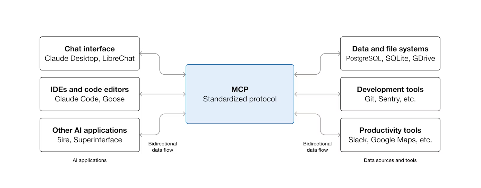 MCP creates a universal connection layer between AI applications and your existing tools and data sources.
