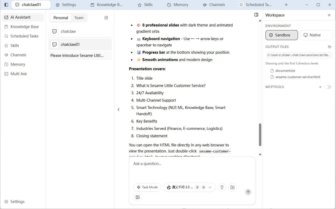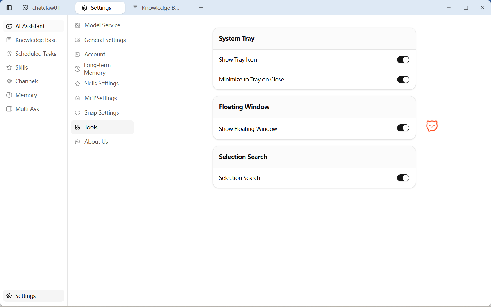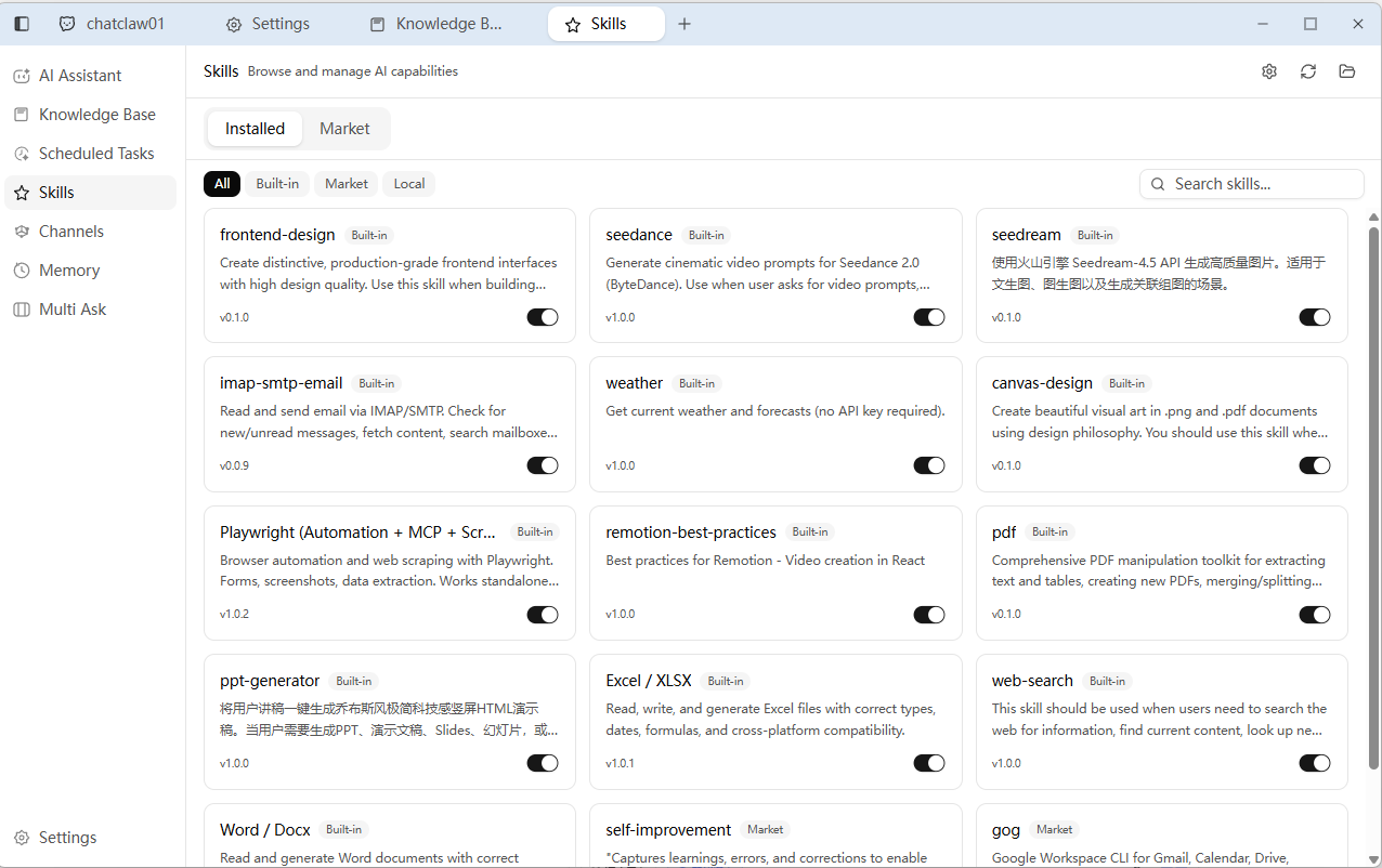 ChatClaw是一个快速部署的个人AI智能体工具,5分钟即可搭建本地知识库AI助手。具有沙箱安全防护,支持连接WhatsApp、Telegram、Slack等主流通讯应用,内置技能市场、知识库、记忆和计划任务等功能。采用Go语言开发,安装包小巧(约30MB),资源占用少。