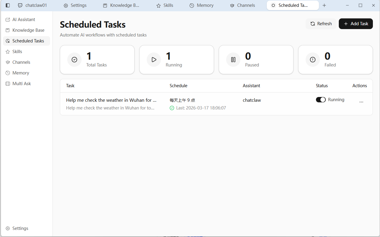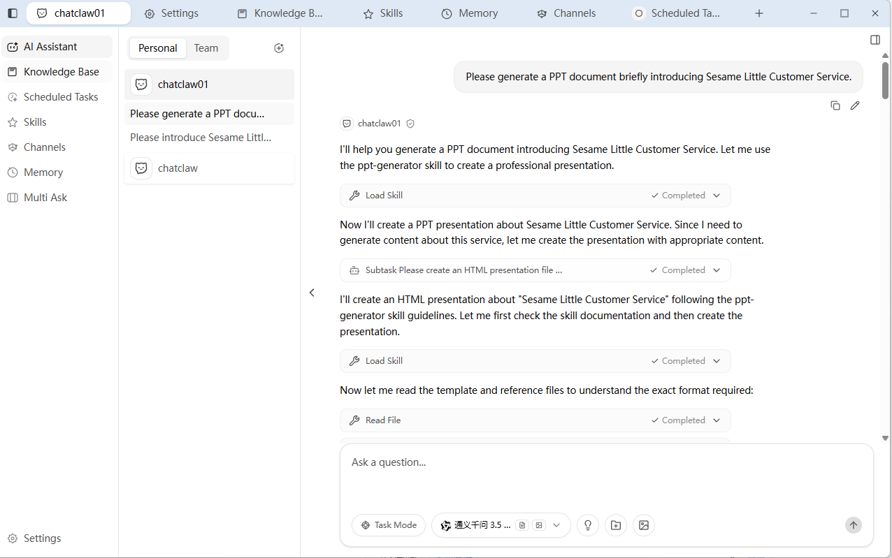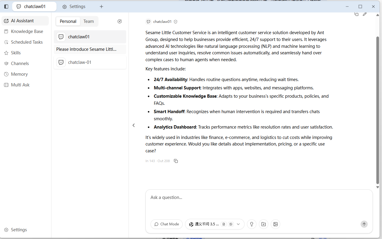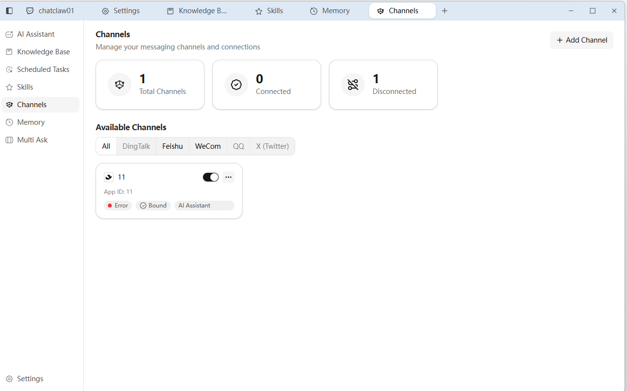 ChatClaw是一个快速部署的个人AI智能体工具,5分钟即可搭建本地知识库AI助手。具有沙箱安全防护,支持连接WhatsApp、Telegram、Slack等主流通讯应用,内置技能市场、知识库、记忆和计划任务等功能。采用Go语言开发,安装包小巧(约30MB),资源占用少。