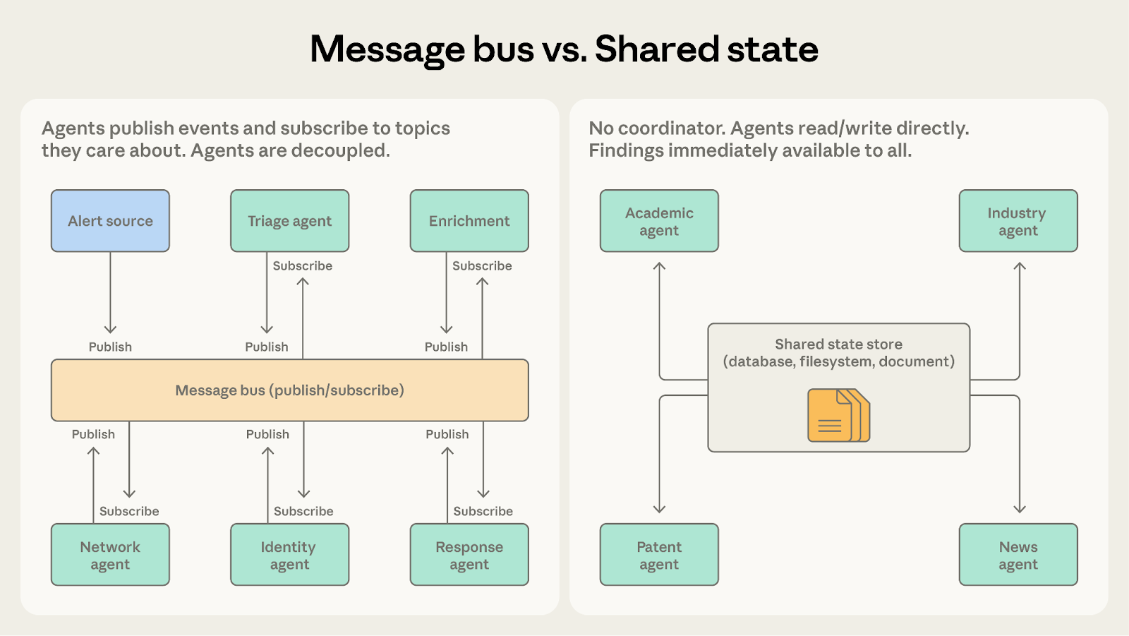 • Choose shared state when agents build on accumulated findings over time. The research synthesis system gathers knowledge continuously. Agents return to the store repeatedly, seeing what others have discovered and adjusting their investigations.