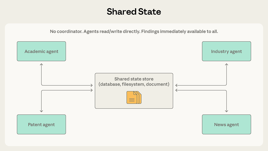 With shared state, findings go directly into the store. The industry agent can see the academic agent's discoveries immediately, without waiting for a coordinator to route the information. Agents build on each other’s work, and the shared store becomes an evolving knowledge base.