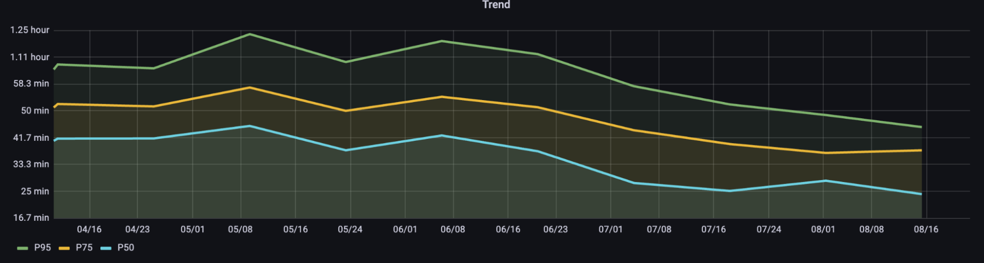 Figure 8. 14 day aggregate percentiles of p50, p75 and p95 for total CI pipeline times for the Grab app codebase
