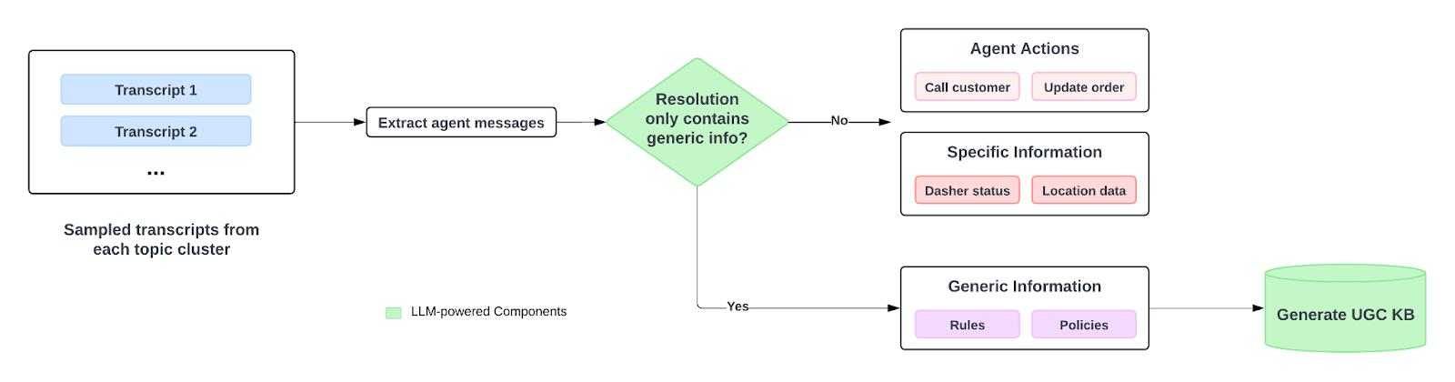 Figure 2. LLM processes transcripts and classifies them into different resolution types. Generic informational resolution becomes a prioritized candidate for new KB articles.