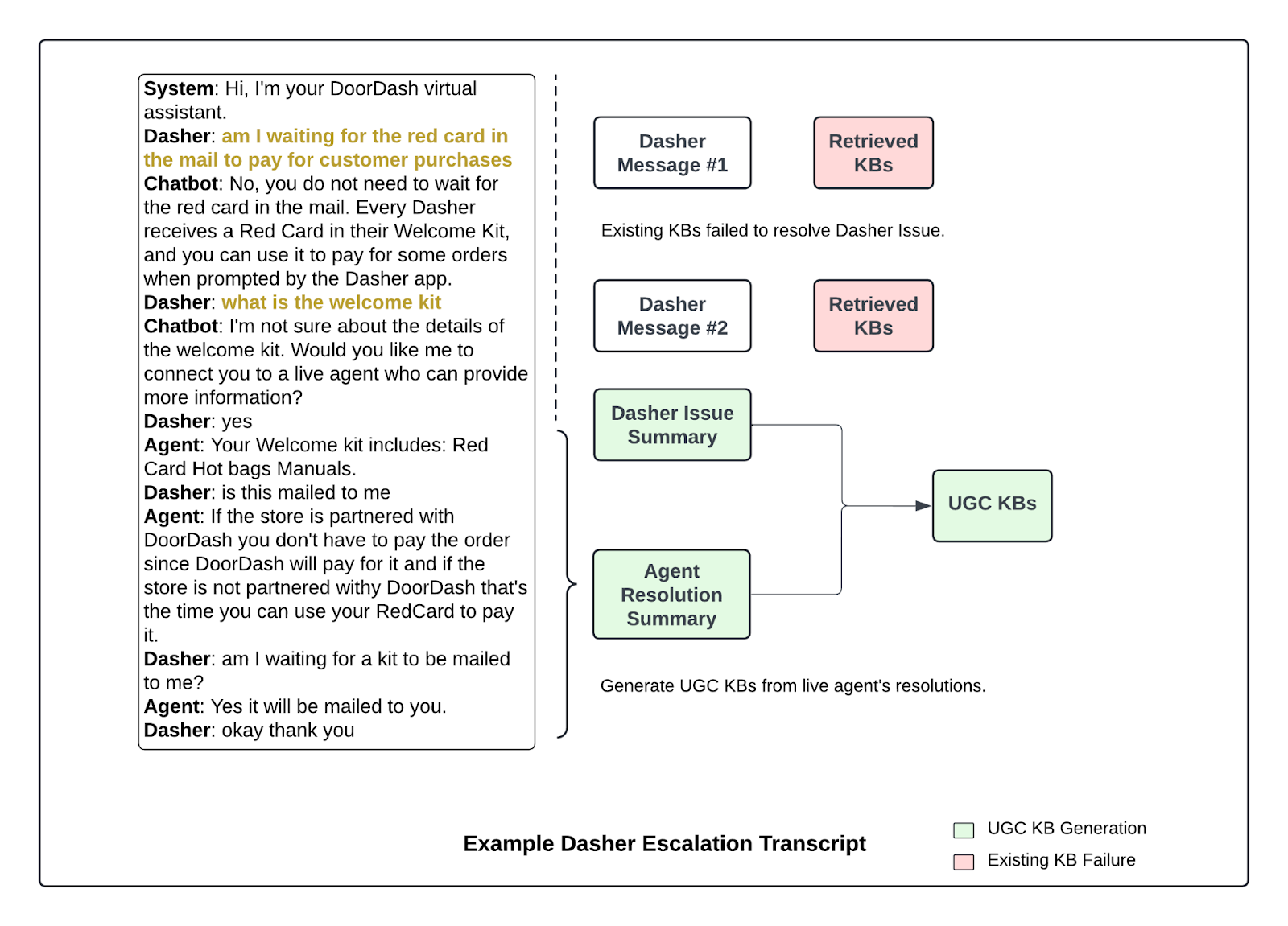 Figure 3. Unresolved chatbot interactions are escalated to live agents, whose resolutions are converted into new user-generated KB articles by LLM.