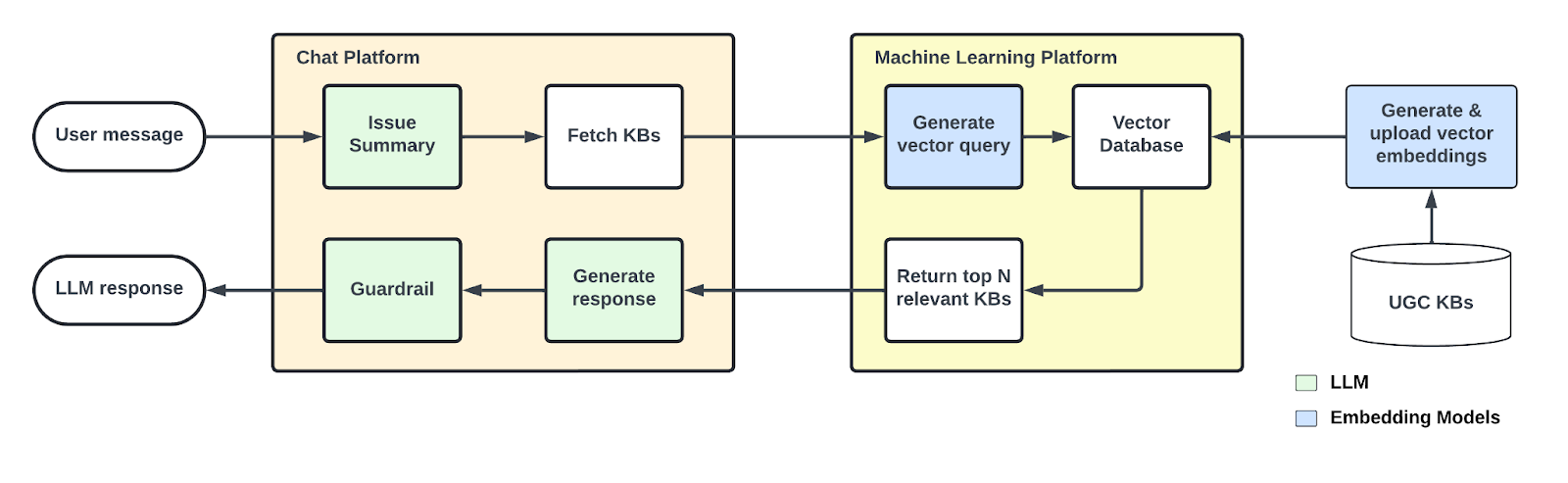 Figure 4. Serving UGC KBs in production: user-generated KBs are embedded, stored, and retrieved through a vector database, enabling the chat platform to fetch the most relevant content and generate safe, accurate LLM responses.