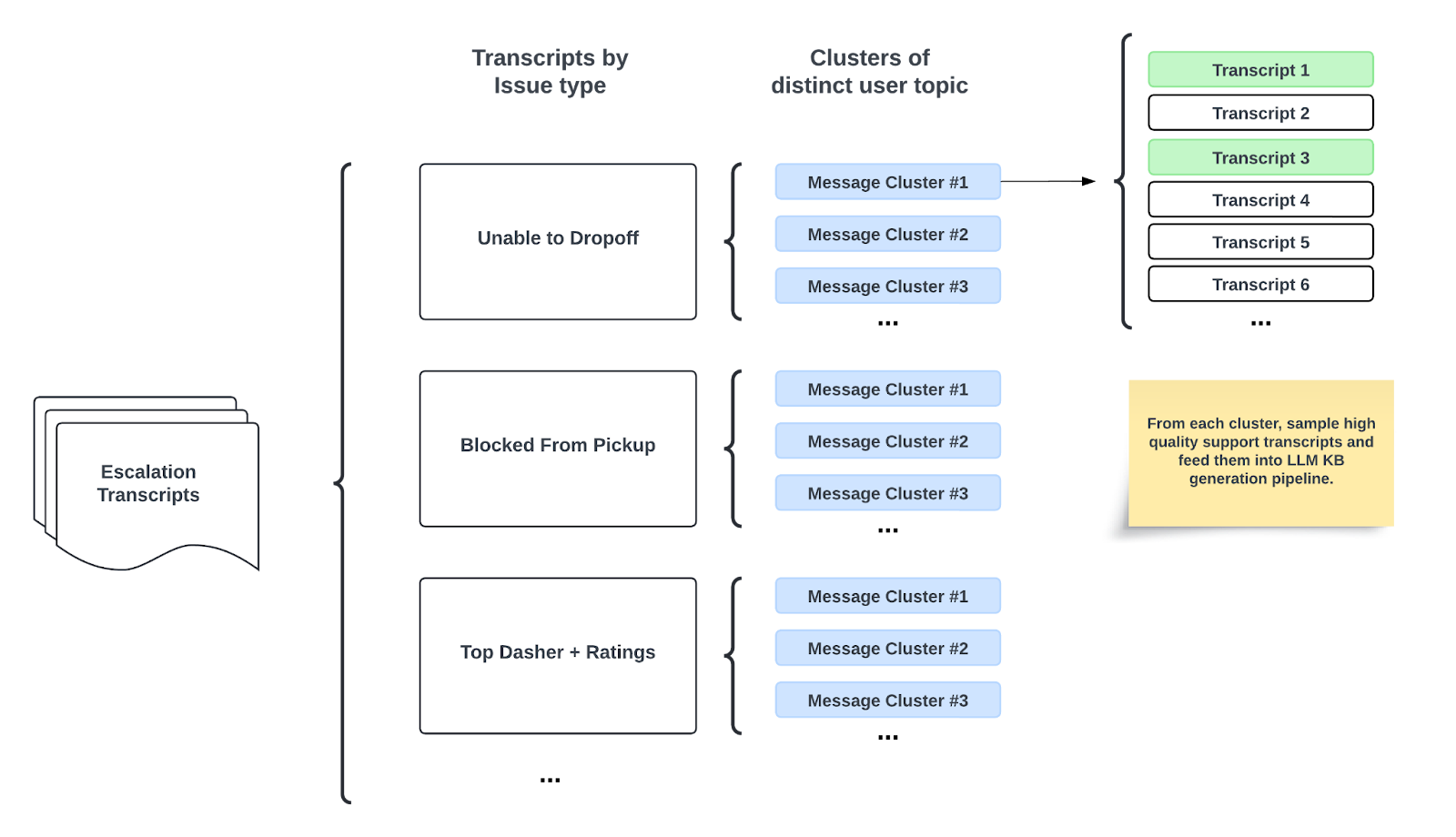 We begin by feeding thousands of anonymized chat transcripts into a semantic clustering pipeline, selecting only those conversations that were escalated to a live agent so that we can zero in on the cases where our chatbot fell short. The clusters that emerge highlight the issues causing the most friction for Dashers and customers, allowing us to rank gaps in the knowledge base, or KB, by both frequency and severity.